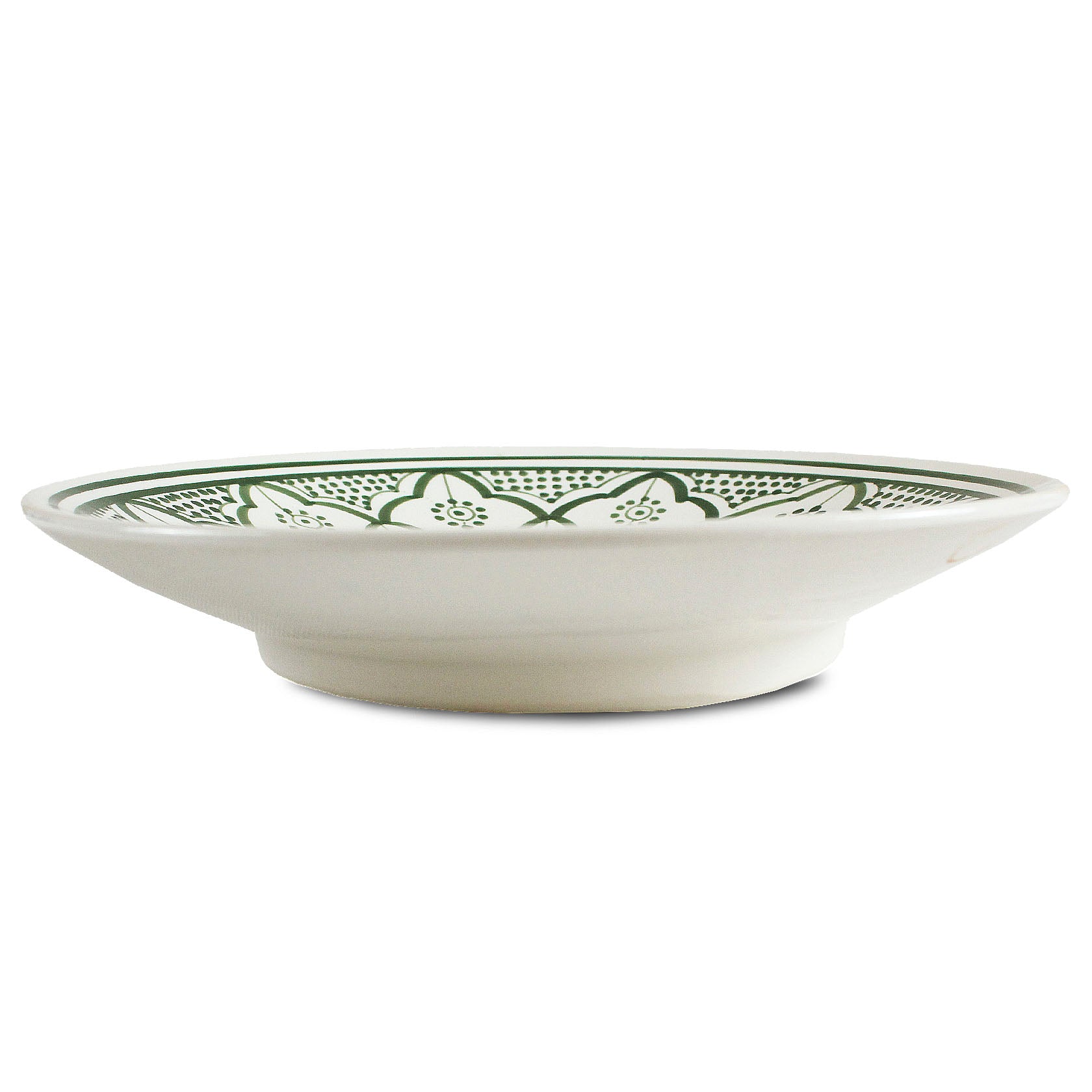 Cette assiette, de type "Zwak", est fabriquée à Safi, ville renommée pour son artisanat céramique au Maroc. Réalisée à la main en argile blanche, elle est ornée de motifs traditionnels finement peints en vert, symbolisant l’élégance et le savoir-faire authentique marocain. Parfaite pour embellir votre table ou votre intérieur, cette pièce reflète l’art et la tradition de Safi.