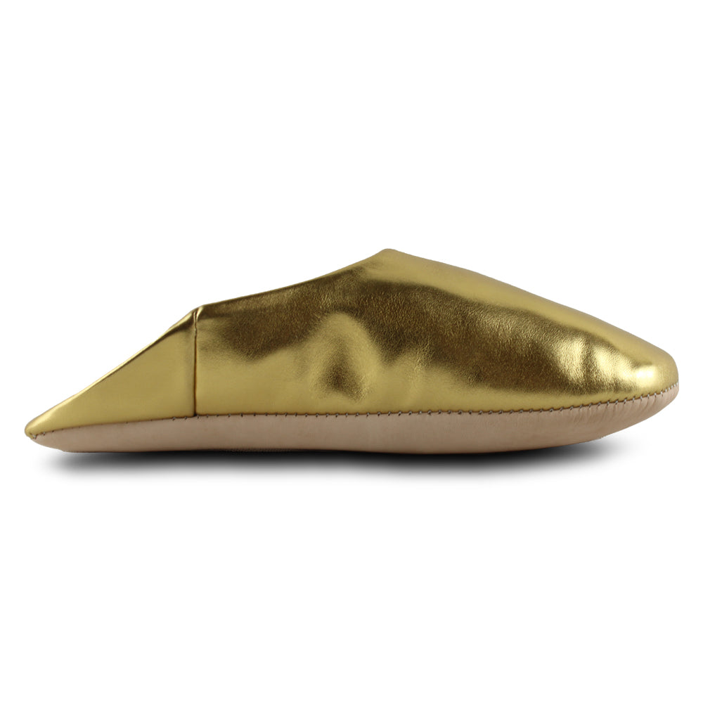 Babouche Marocaine ronde pour femme. Fabriquée à la main en cuir véritable et cuir artificiel doré. Très souple, confortable et facile à enfiler cette babouche est adaptée exclusivement à une utilisation intérieur.