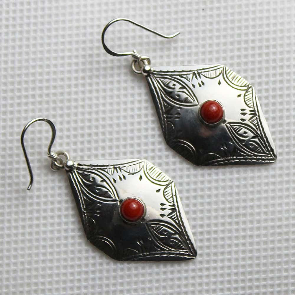 Boucles d'oreilles style berbère avec pierre rouge au centre, 100 Fait main à Tiznit.