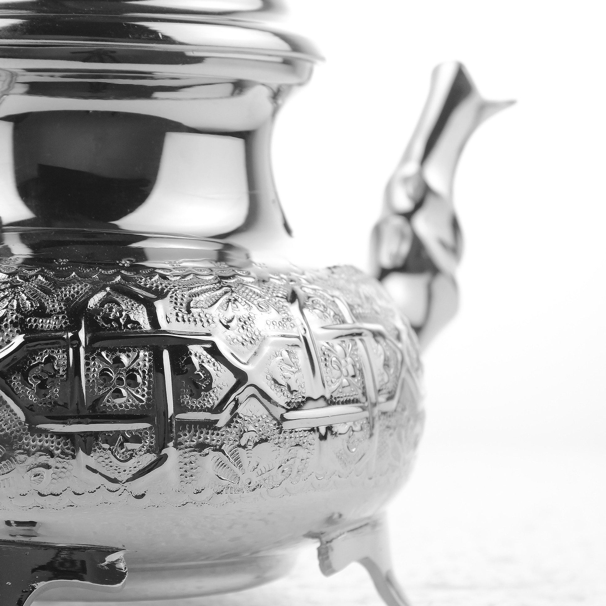 Sa grande anse permet de bien la tenir. Son long bec verseur facilite l’évacuation du thé et aide à l’aération de la théière. Elle est très pratique pendant les mariages pour la préparation du thé à la menthe en grande quantité.